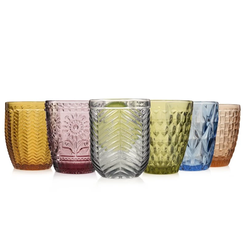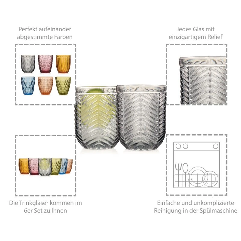 Moderne, bunte Trinkgläser, die aus einer anderen Zeit zu sein scheinen, in sechs, sorgfältig aufeinander abgestimmten Farben: Grün, Bernstein, Blau, Grau, Braun, und Lila werden Ihren gedeckten Tisch perfekt ergänzen. Dieses spülmaschinenfeste Wassergläser Set sieht nicht nur toll aus, es ist äußerst funktional, langlebig und robust