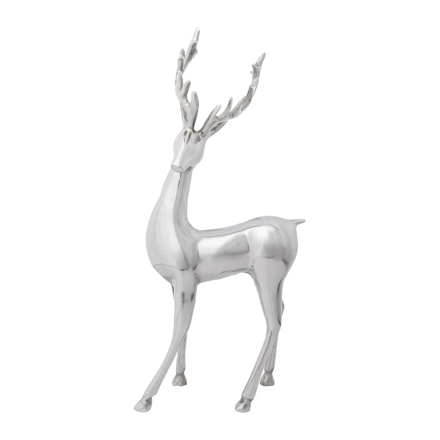 Dieser Deko-Hirsch ist aus hochwertigem Aluminium gearbeitet und ist mit seiner Höhe von 40 cm ein Blickfang. Durch die elegante und schlichte Form fügt er sich wunderbar in Deine Weihnachtsdeko ein, ohne aufdringlich zu wirken. Du kannst die silberne Hirschfigur z.B. neben dem Weihnachtsbaum platzieren und das Kerzenlicht spiegelt sich in der leicht glänzenden Oberfläche. Auch im Flur oder vor Deiner Haustür, kombiniert mit Ästen, Zweigen oder einer kleinen Tanne, zauberst Du mit diesem Dekohirsch im Handumdrehen eine stilvolle Weihnachtsdeko. Wenn Du den Hirsch mit der etwas größeren Figur aus dieser Serie kombinierst, erhälst Du ein Deko-Highlight für Dein zu Hause, das alle Blicke auf sich ziehen wird. Die Maße des Hirsches betragen 40x20x11cm.