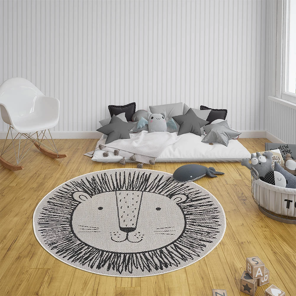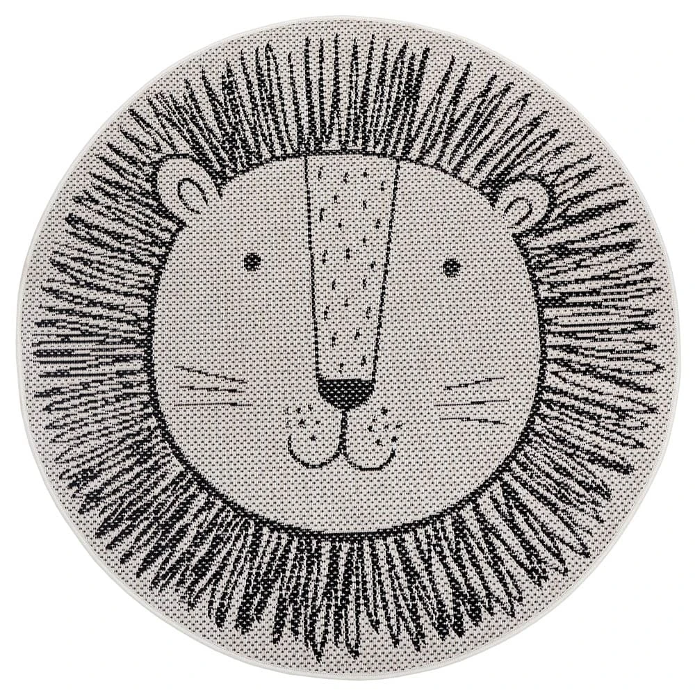 Flachgewebe Kinderteppich Löwe Rund Creme/schwarz