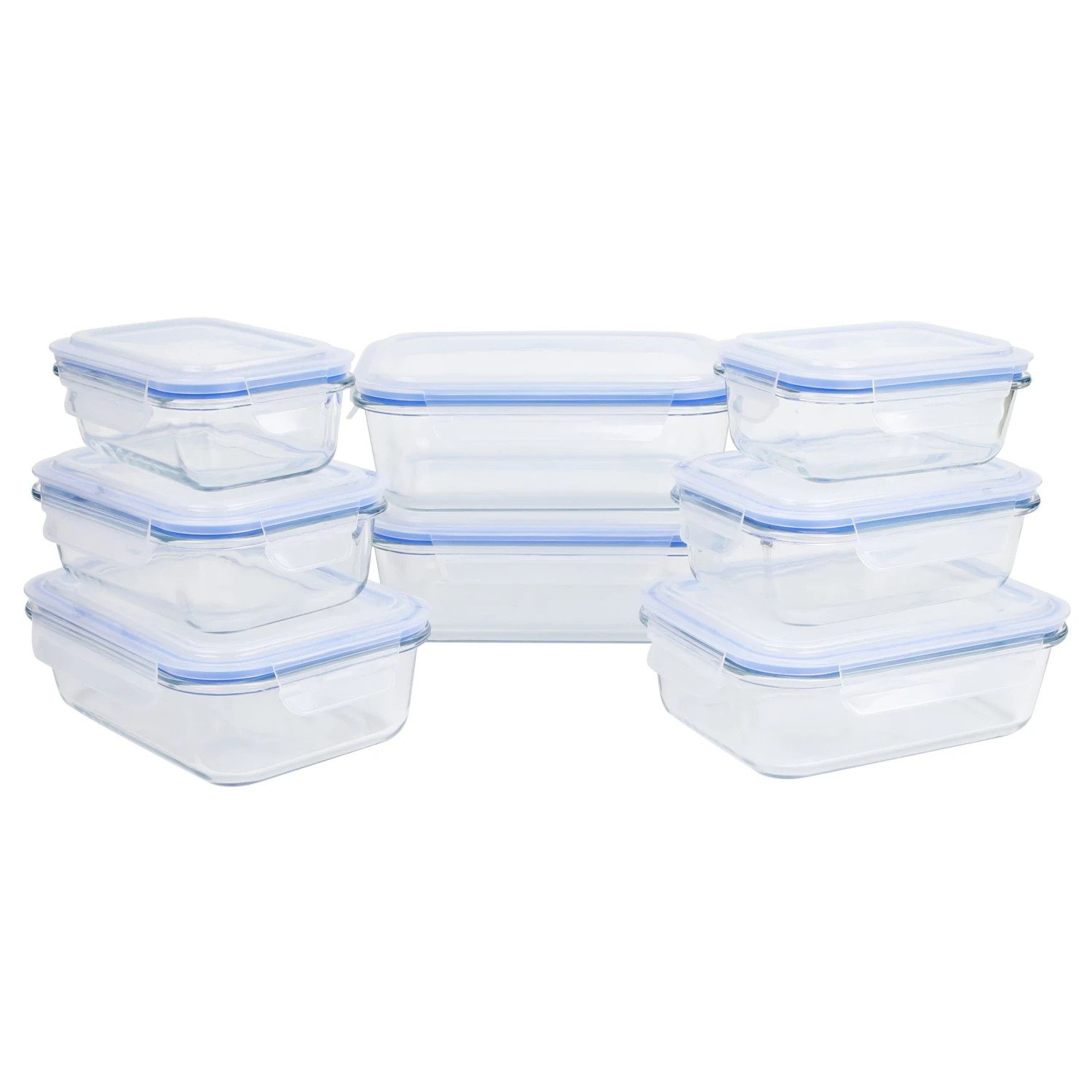 Einen farbigen Touch bekommen die Dosen dank des blauen Silikondichtungsrings rundum. Die Vorratsgläser haben ein Fassungsvermögen von je ca. 370 ml, ca. 640 ml, ca. 1040 ml bzw. ca. 1520 ml und eignen sich daher bestens zur Aufbewahrung von Resten bis hin zu ganzen Gerichten oder zur getrennten Lagerung von Beilagen, Soßen & Co. Ob im Kühl- oder Gefrierschrank – das 8-teilige Glasbehälter-Set kommt überall gut an, wo es um die Verwahrung von Speisen geht.