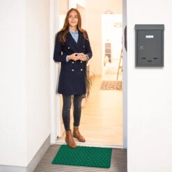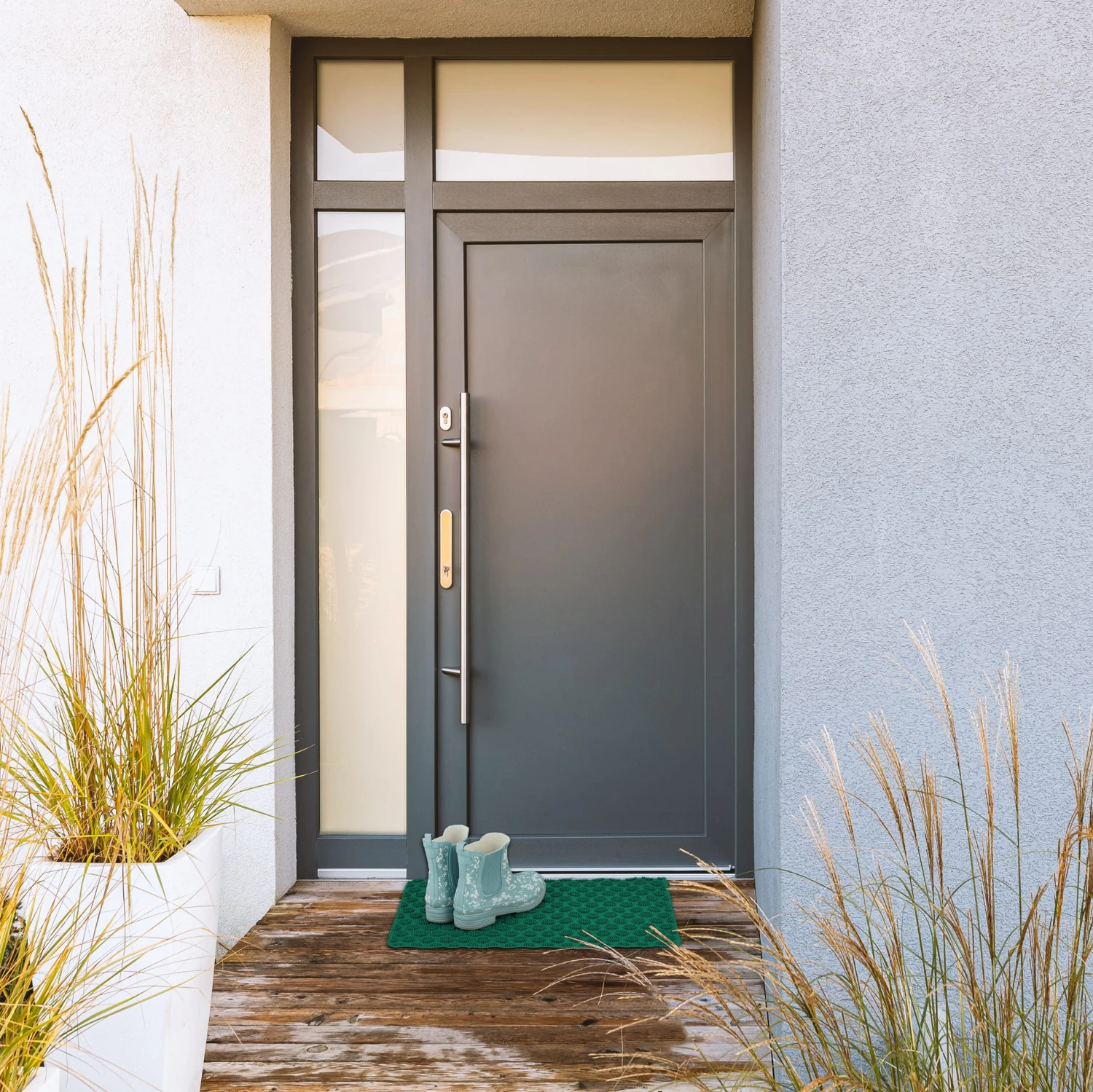 Mit diesem grünen Fußabstreifer vor der Haustür hältst Du Deine Innenräume zuverlässig sauber. Der wetterfeste Schuhabtreter kann dazu sowohl drinnen als auch draußen platziert werden. Beim Abstreifen Deiner Schuhe dringen die vielen kleinen Noppen der Gummimatte in das Profil ein und entfernen so auch hartnäckigen Schmutz. Dank der Fertigung aus robustem Gummi hält die Schmutzmatte dabei sicher am Boden. Zum Reinigen kannst Du die Schmutzfangmatte einfach abwischen.
