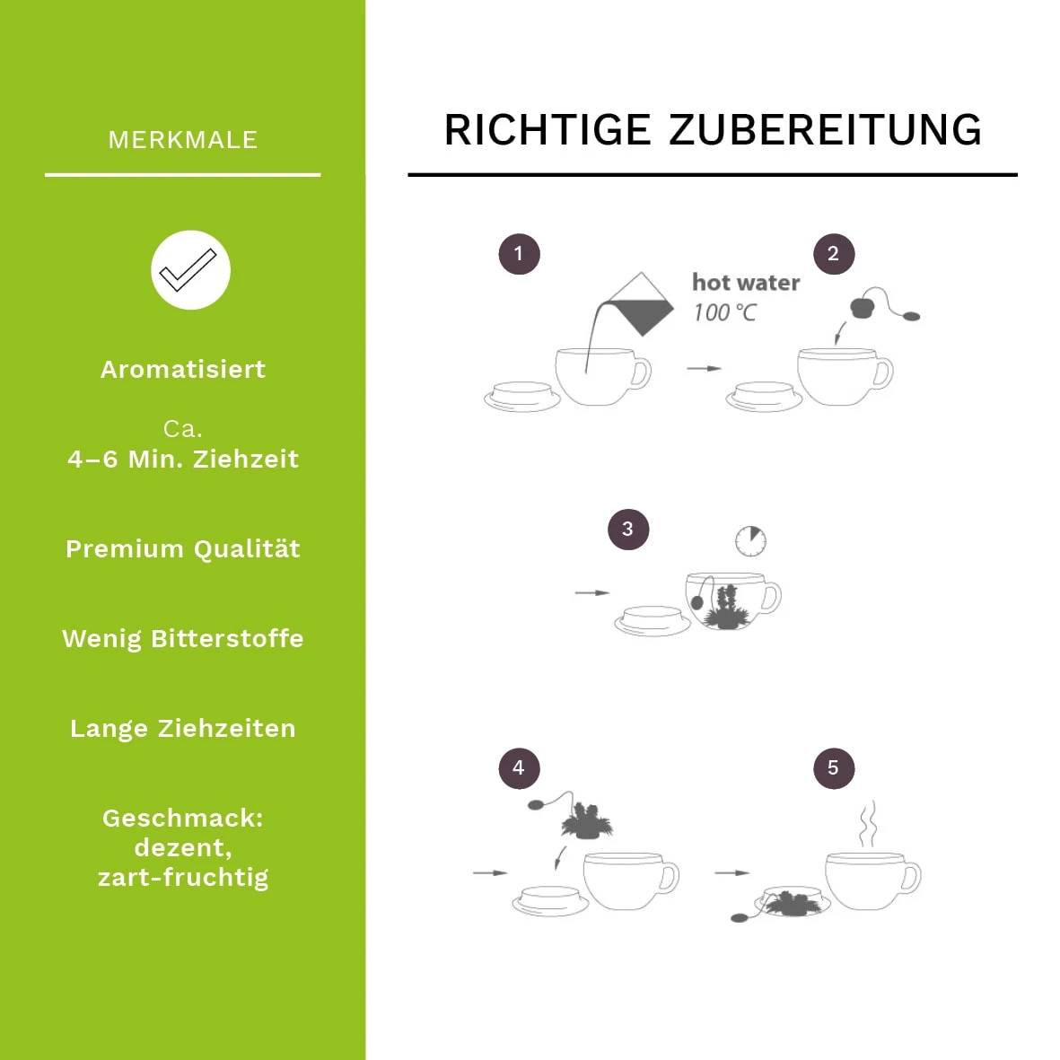 Grüner Tee, Blüten von Ringelblume, Jasmin, Hibiskus, Holunder, Rose, Aroma (Erdbeer, Kirsch, Mango, Zitrone)