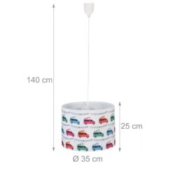 Mit dieser dekorativen Schirmlampe bringst Du nicht nur das Kinderzimmer, sondern ebenso die Augen Deiner Kleinen zum Leuchten und schaffst eine gemütliche Atmosphäre. Der runde Lampenschirm überzeugt mit seinen niedlichen Autos in Blau, Grün, Rot und Orange. Verabschiede Deine kleinen Abenteurer nach einem anstrengenden Tag ins Traumland oder sorge am Morgen für ein sanftes Aufwachen. Dank des verstellbaren Kabels kann die Höhe der Lampe individuell bestimmt werden.