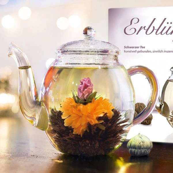 Geschmacklich ist dieser schwarze Tee ungewöhnlich mild. Er verträgt außergewöhnlich lange Ziehzeiten ohne zu verbittern und überzeugt durch seinen vollmundigen aromatischen Geschmack. Die unterschiedlich kunstvoll eingearbeiteten Blüten des ErblühTees geben dem Tee eine zusätzliche individuelle Geschmacksnote.