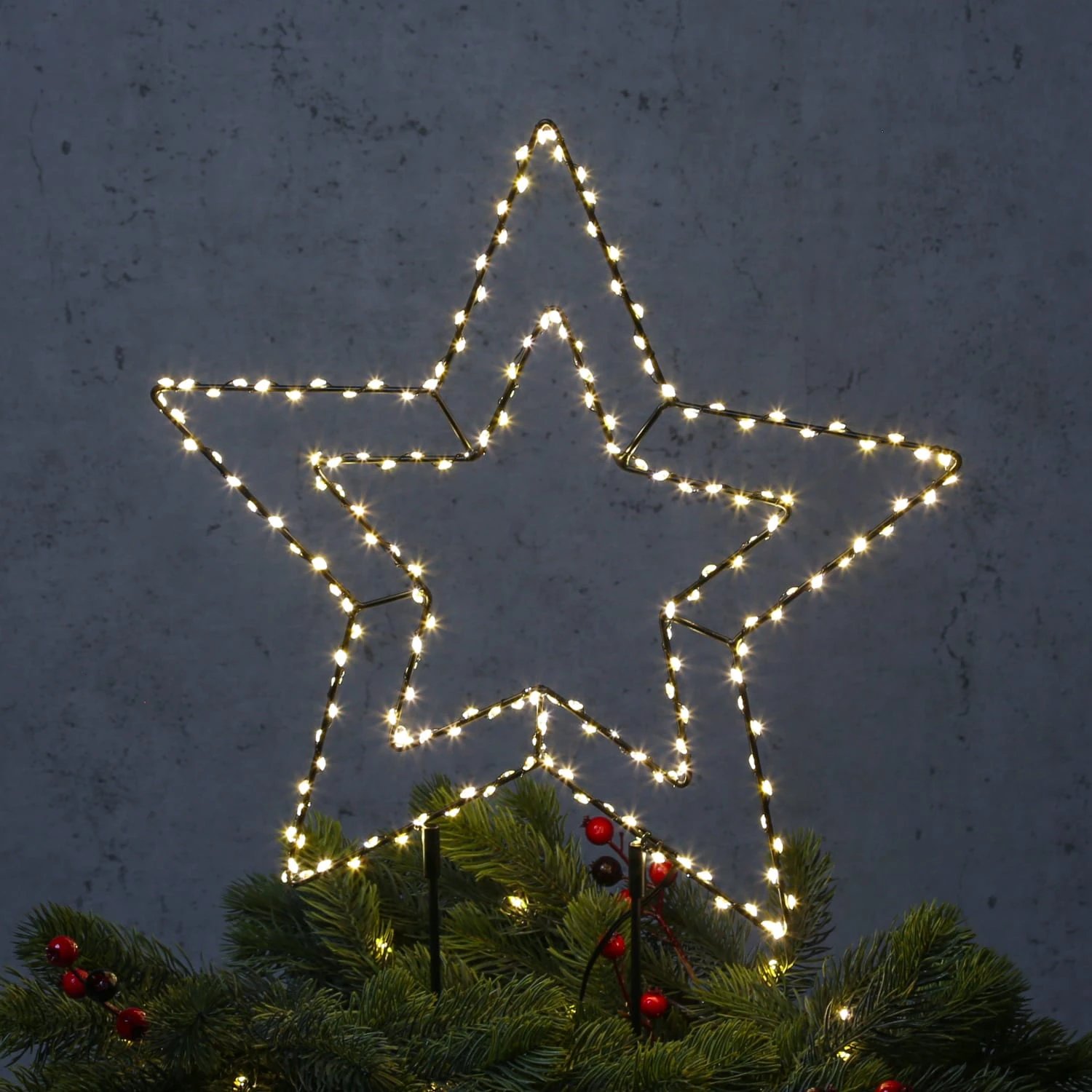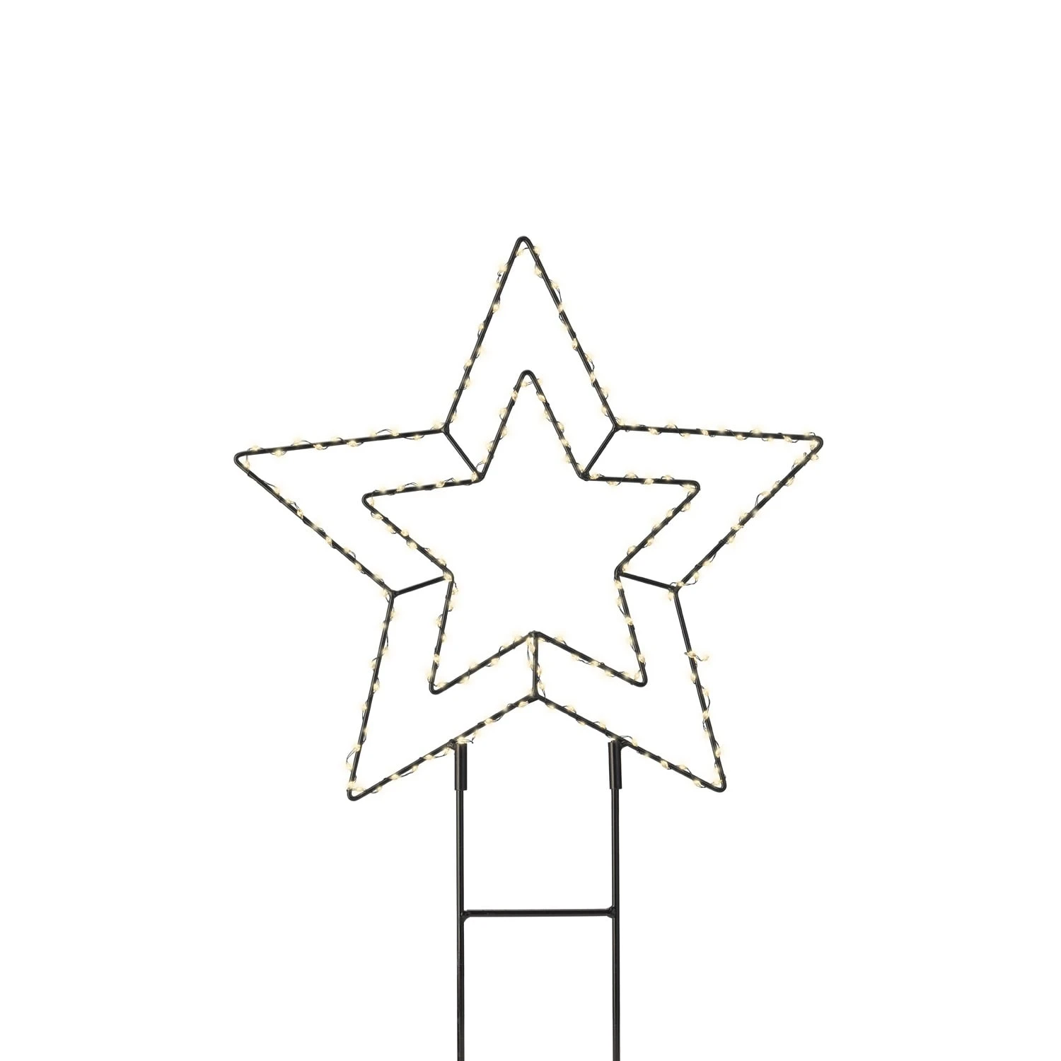 LED Gartenstecker STERN – 180 warmweiße LED – D: 38cm – Trafo – für Außen – schwarz Dieser LED Gartenstecker als Stern ist in der Weihnachtszeit ein echter Hingucker in Deinem Vorgarten, in Blumentöpfen, Balkonkästen oder im Blumenbeet im Garten. Die Drahtlichterkette mit den 180 warmweißen LED schlängelt sich um das schwarze Gestell des Sterns und leuchtet einfach wunderschön.