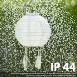 – Durch das eingesetzte Nylon und die IP44 geschütze LED sind die Solar Lampions für den Einsatz im Freien geeignet.