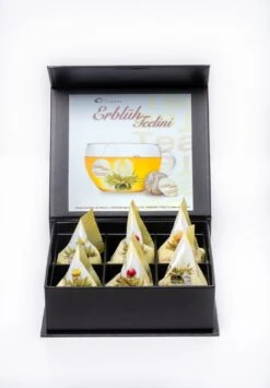 Die 6 ErblühTeelini-Kugeln in 4 verschiedenen Variationen sind in einer edelen mattschwarzen mit einem silbernen Prägedruck versehenen Magnetbox verpackt, welche das Teeerlebnis vom ersten Augenblick an zu etwas ganz Besonderem macht. Die hochwertige Verarbeitung und Stabilität gewährleistet auch eine Nutzung nach dem Verbrauch des Tees und kann je nach Belieben mit Nachfüllpackungen der ErblühTee-Kugeln nachgefüllt werden. Eine dekorative Nutzung bietet sich ebenso an…