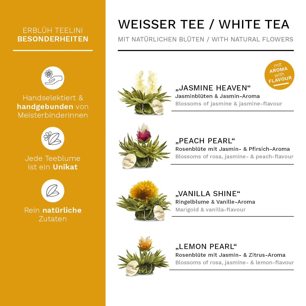 Geschmacklich ist der Weiße Tee leicht und lieblich mit einem unverwechselbaren fruchtigen Aroma. Die unterschiedlich kunstvoll eingearbeiteten Blüten und sortenabhängigen feinen Aromen (Vanille, Jasmin, Pfirsich und Zitrone) geben dem ErblühTeelini eine zusätzliche individuelle Geschmacksnote.