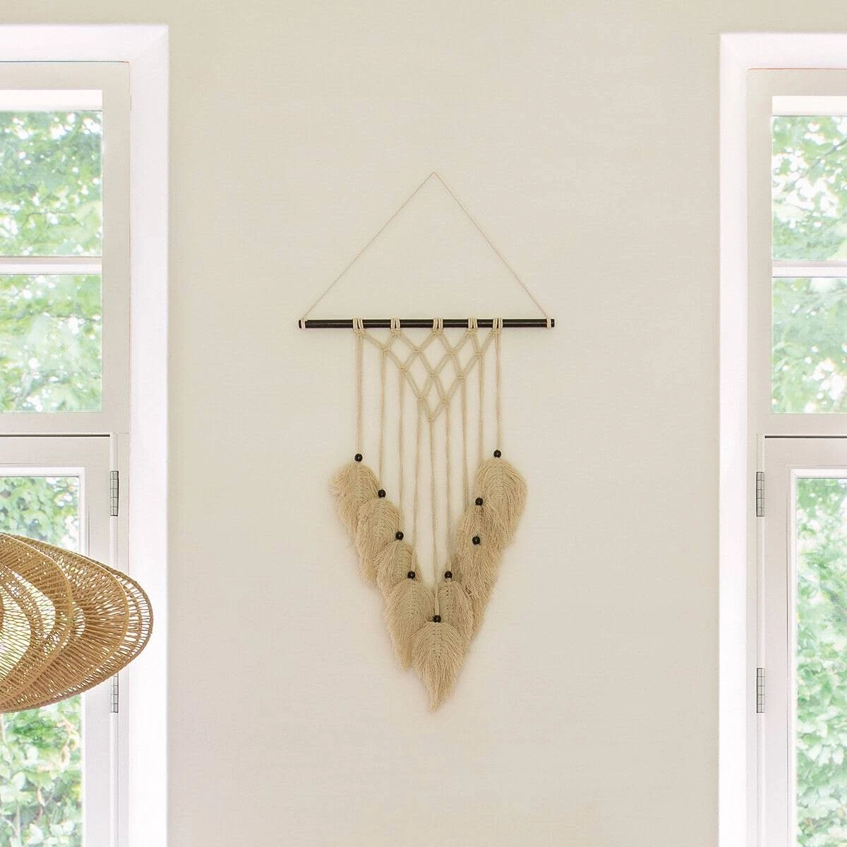 Das Produkt zeichnet sich durch symmetrische Muster aus, die aufgrund einer komplizierten Knotenkombination entstehen. Das SAFARI Makram wurde mit einer Baumwollschnur in natürlicher Beige gewebt. An der Unterseite befinden sich dekorative Fransen, die blattförmigen oder zarten Federn ähneln. Das Ganze zeichnet sich in erster Linie durch eine minimalistische Form aus, die in die Ästhetik des Boho passt.