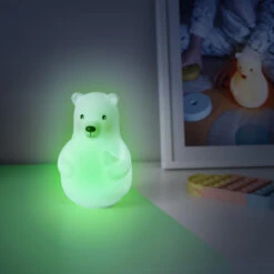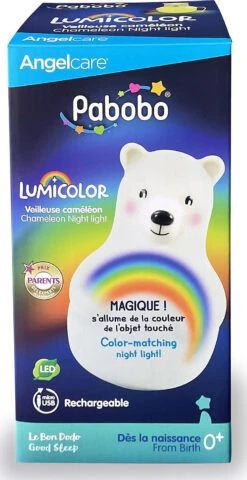 Das Nachtlicht Lumicolor der Bär von Pabobo leuchtet in der Farbe, die du gewählt hast. Der Bär hat drei Modi: 1. Er erkennt die Farbe der Oberfläche, auf der er steht und leuchtet in derselben auf. 2. Der Bär strahlt in warmem, weißen Licht (zwei Leuchtintensitäten). 3. Er wechselt die Farben automatisch. Über einen Mikro-USB-Kabel-Anschluss kann der Bär über den integrierten Akku immer wieder aufgeladen werden. Mit einer Aufladung kann er ca. 24 Stunden leuchten. Dank der LED-Lichter wird das Nachtlicht nicht warm. Lumicolor verfügt über einen automatischen Ausschaltmodus oder kann im Dauermodus betrieben werden.