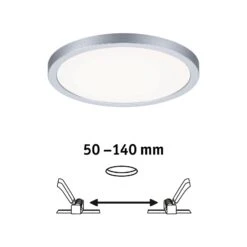 Das runde Einbaupanel Areo mit einem Durchmesser von 175 mm und einer Leistung von 13 Watt in Chrom matt sorgt für flächiges warmweißes Licht. Dank flexibler VariFit-Technik lassen sich die Klemmfedern für den Einbau stufenlos zwischen 50 und 140 mm einstellen. Damit kann das Panel sowohl in bereits vorhandene Bohrlöcher als auch in neue eingebaut werden. Mit der integrierten 3-step-dim Funktion, kann es durch mehrmaliges Betätigen eines handelsüblichen Lichtschalters in drei Stufen gedimmt werden. Die Memory-Funktion merkt sich die zuletzt verwendete Stufe bis zum nächsten Einschalten. Bei einem Bohrlochdurchmesser von 85 mm wird eine Hohlraumtiefe von 30 mm benötigt und bei einem Durchmesser von 68 mm eine Tiefe von 55 mm.