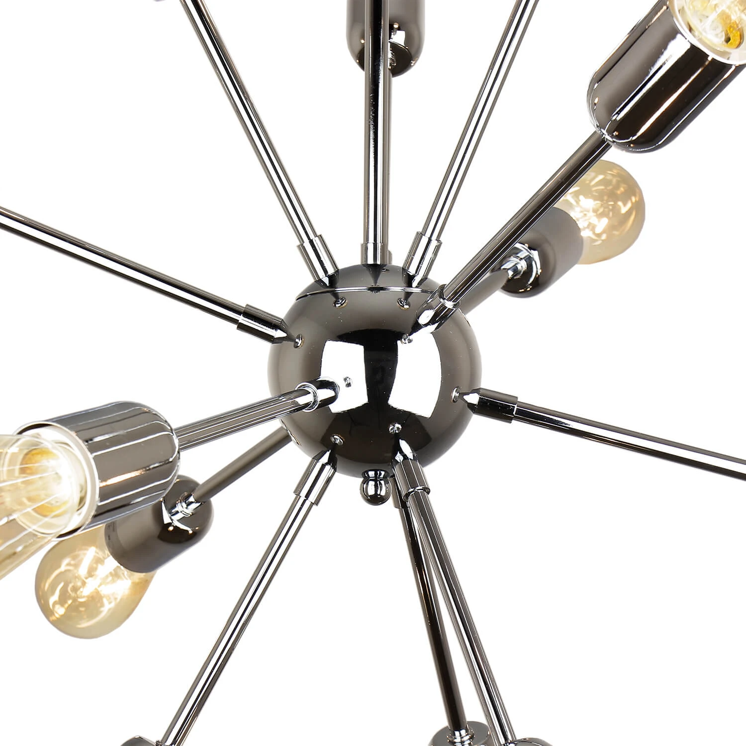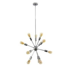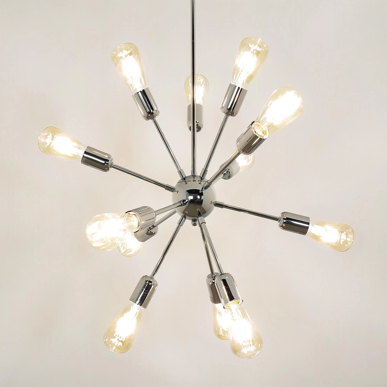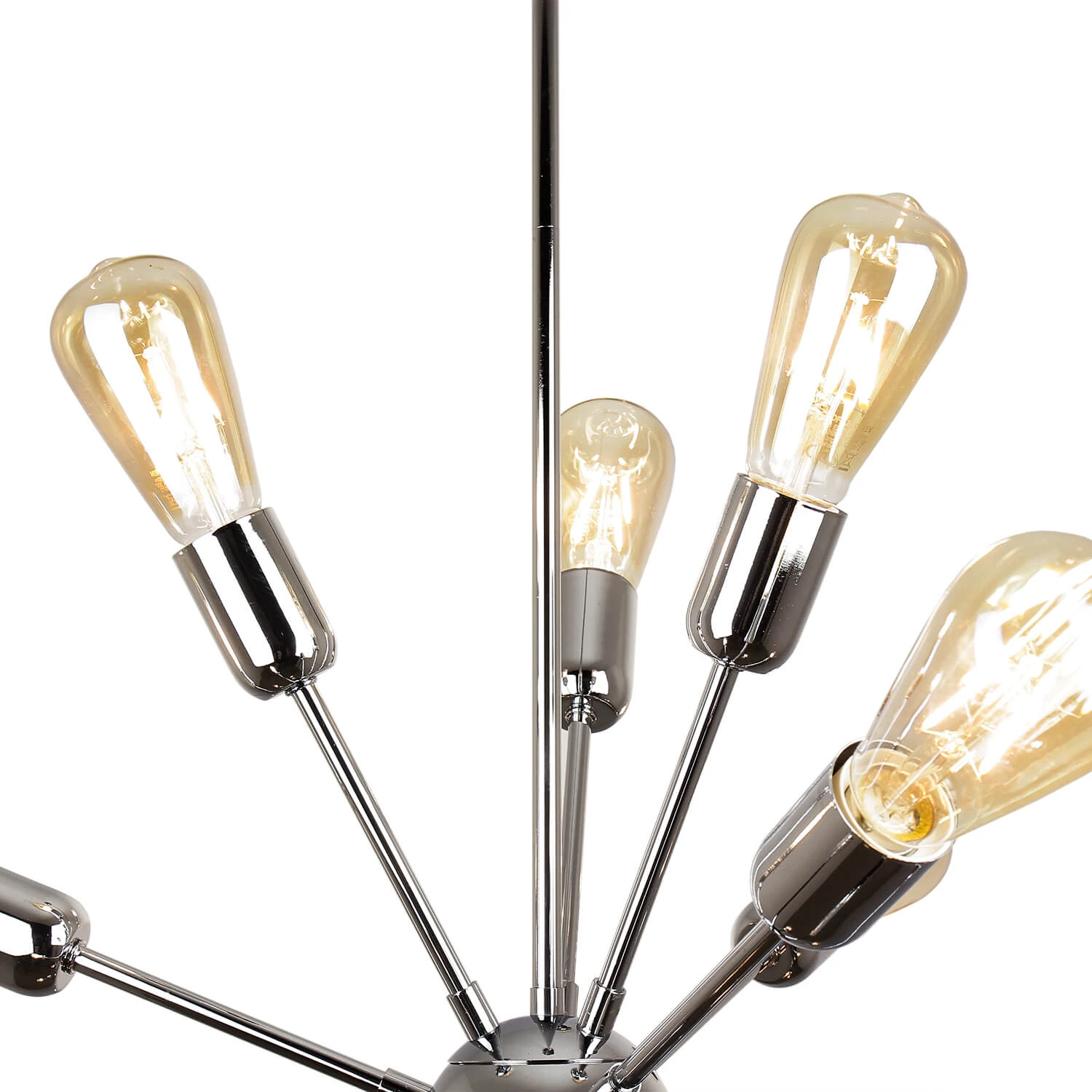 Fassung: 12x E27 bis 60W | Farbe: Chrom | Material: Metall | Spannung: 230V | Spritzschutzklasse:IP20 | Ein absoluter Hingucker! Die stylische Sputnik Hängelampe in Chrom verbreitet in jedem Raum Retro Flair pur und erlaubt gleichzeitig eine großzügige Beleuchtung. | Dank des Gelenkes ist sie auch für die Montage an Dachschrägen geeignet. | Das Design erinnert an alte Sputnik Satelliten und macht aus der Pendelleuchte einen dekorativen Blickfang in jedem Esszimmer und Wohnzimmer. | Ohne Schirm: Variieren Sie den besonderen Look mit Leuchtmitteln in Design, Helligkeit und Farbtemperatur Ihrer Wahl, z.B. einer Edison Lampe oder einem runden Globe Leuchtmittel (Fassung E27, nicht inkl.) | Die Hängeleuchte ist bereits vormontiert und kann mittels externen Dimmer und geeigneten Leuchtmitteln gedimmt werden (nicht inkl.).