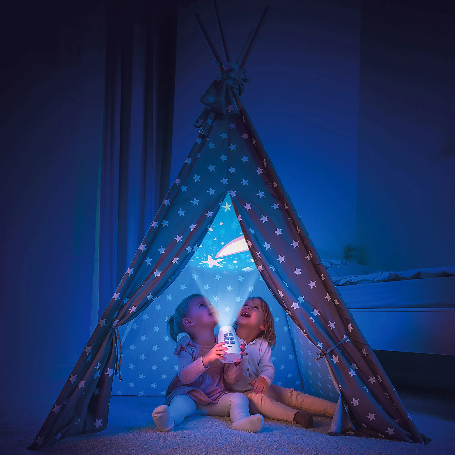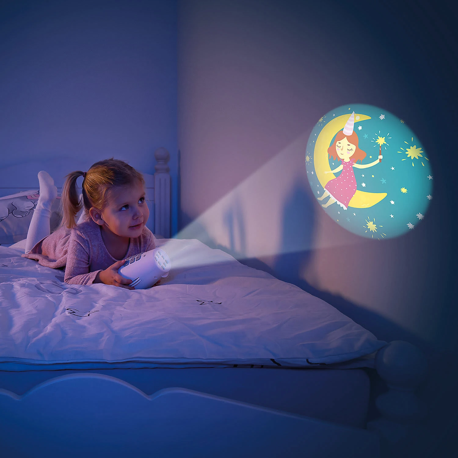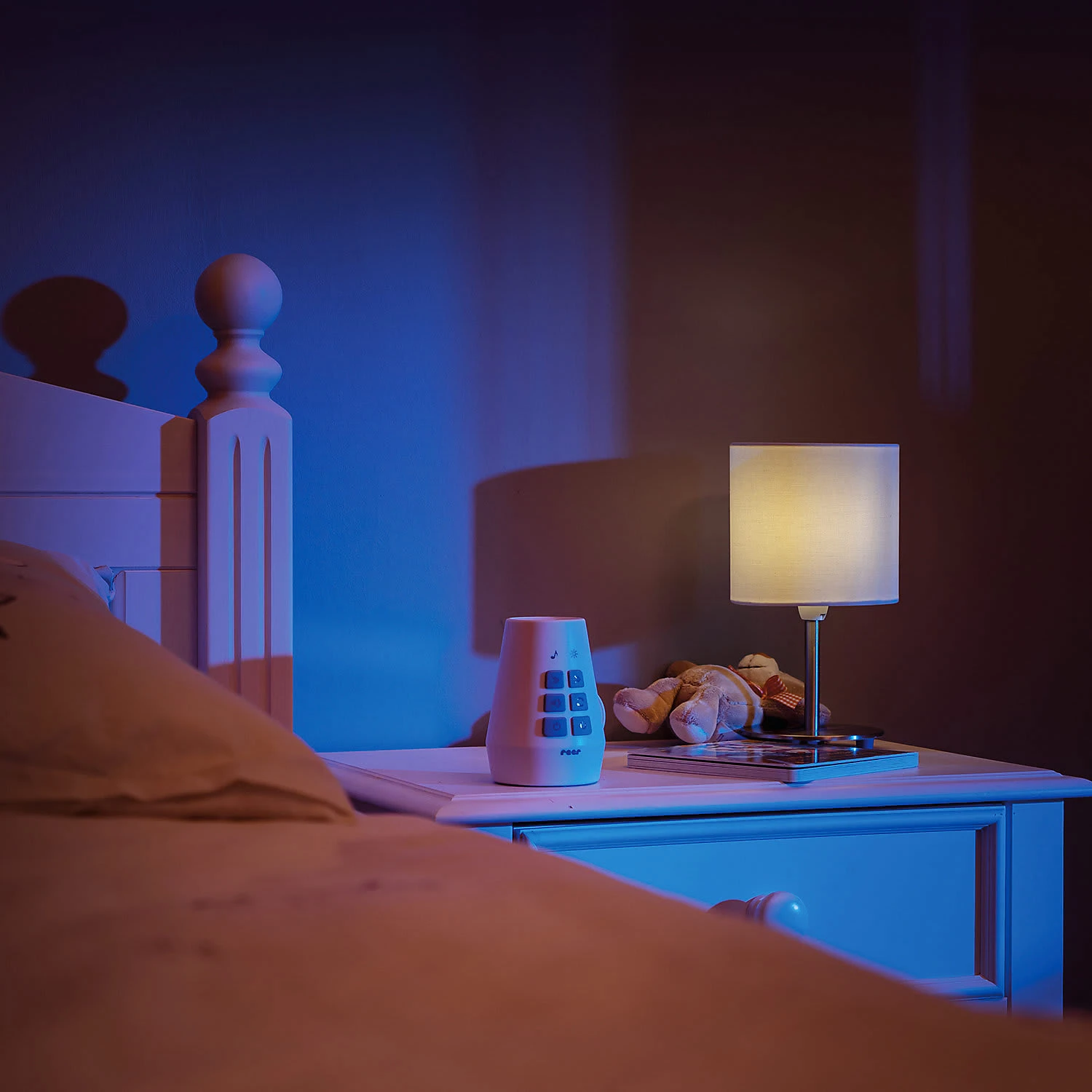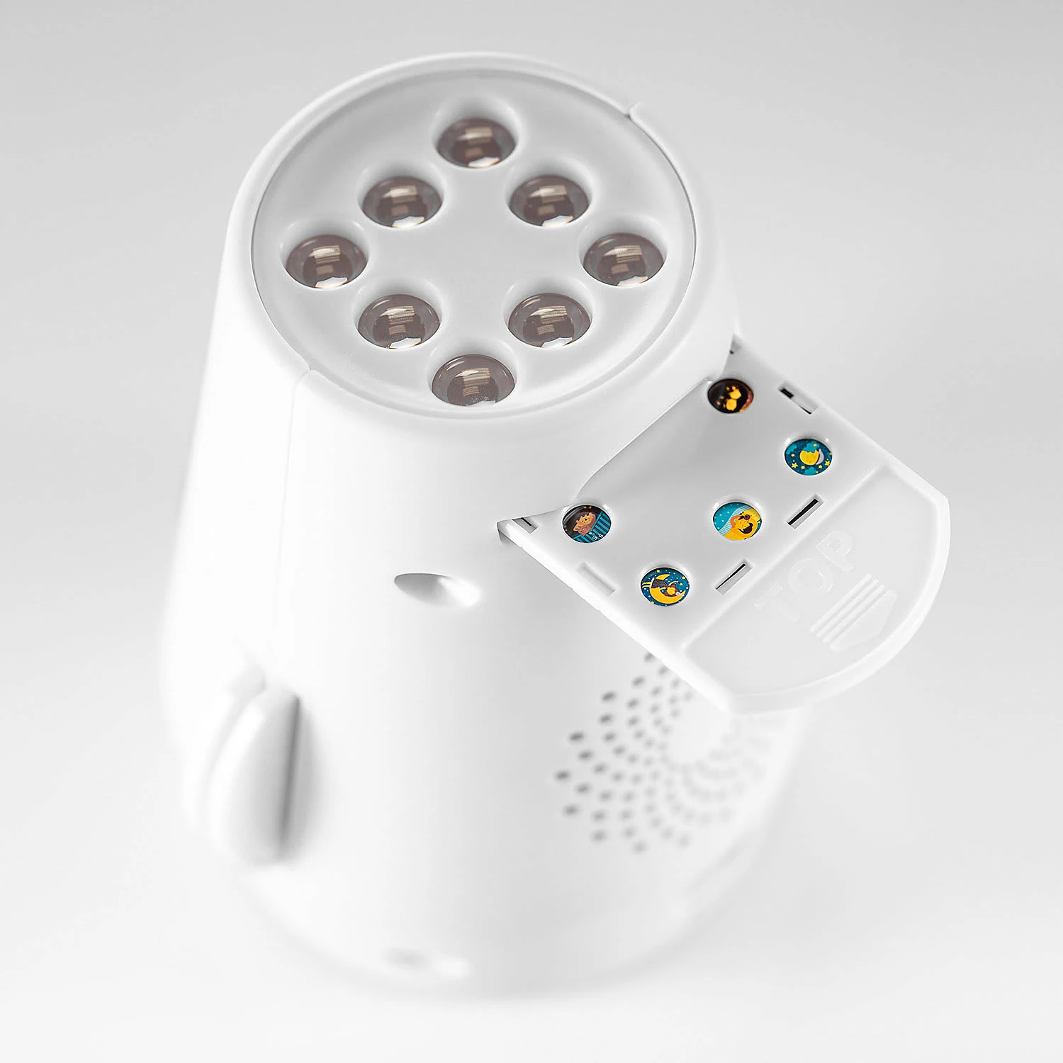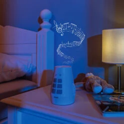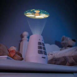 Schick Dein Kind auf Phantasie-Reise mit dem DreamBeam Motivprojektor! 24 unterschiedliche Motive auf 3 verschiedenen Scheiben eröffnen Dir einen Kosmos an Geschichten und Träumen. Schalte das Gerät an und verzaubere Dein Kind mit den süßen Bildern, die der DreamBeam an die Decke, die Wand oder auf das Bettlaken zaubert. Eine Reise mit dem Segelschiff, begeisternde Besuche auf Baustellen, Fangen spielen mit den Füchsen? Kein Problem, der Phantasie und der Spielfreude Deines Kindes sind keine Grenzen gesetzt mit den zauberhaften Motiven, die der DreamBeam von reer bietet. Der Motivprojektor zaubert faszinierende Lichtprojektionen an Wand oder Decke. Die verschiedenen Bilder befinden sich auf 3 Motivscheiben. Jede Scheibe beinhaltet 8 farbenfrohe Motive aus der Tierwelt, der Traumwelt und der Erlebniswelt. Die einzelnen Bilder können wahlweise auf ein Motiv festgestellt oder sanft wechselnd abgespielt werden. Der DreamBeam ist zusätzlich mit einer Musikfunktion ausgestattet. Zehn klassische Kinderlieder und fünf Naturgeräusche sorgen bei Bedarf für die akustische Untermalung des Abenteuers. Dank verschiedener Lautstärkenstufen können die Melodien ganz auf die Bedürfnisse und Umgebung des Kindes abgestimmt werden. Durch die Timer-Funktion schaltet sich die Musik nach 30 Minuten automatisch aus. Zum Abspielen der gewünschten Motivscheibe wird diese einfach oben in den Projektor eingelegt. So können selbst schon die Kleinsten die Scheiben eigenständig wechseln. Die beiden anderen Motivscheiben können währenddessen in den seitlichen Einschüben aufbewahrt werden. So kann keine Scheibe verloren gehen. Der DreamBeam kann mit Batterien betrieben werden. Dadurch kann es unabhängig von Stromquellen überall flexibel aufgestellt oder in der Hand gehalten werden. Die kindersichere Verschraubung des Batteriefachs verhindert dabei, dass Dein Kind die Batterien in die Finger bekommt. Mit dem mitgelieferten Micro-USB- Kabel kann es auf Wunsch aber auch über Steckdosen betrie