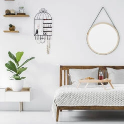 Mit diesem Schmuckhalter bewahren Sie Ihren Schmuck übersichtlich und geordnet auf. Der Schmuckorganizer bietet Platz für Ohrringe und -stecker, Armbänder, Uhren und Halsketten. Da die Schmuckleiste an die Wand montiert wird, lassen sich auch lange Halsketten problemlos aufhängen und sind vor Verheddern geschützt. Dank des romantischen Vogelkäfig-Designs ist der Ohrringhalter zudem ein echter Hingucker und eine stylische Präsentationsmöglichkeit für Ihren Lieblingsschmuck.