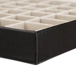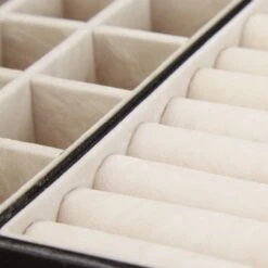 Durch das platzsparende Design passt der Schmuckkasten problemlos in jede Schublade. Die Materialen Kunstleder und Samt verleihen dem Schmucktablett zeitlose Eleganz und schützen die Schmuckstücke zusätzlich vor dem Zerkratzen.
