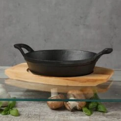 Gusspfanne mit 2 Griffen u. Holzuntersetzer – Gusseisen – D: 18cm – Servierpfanne – rund Kochen und Grillen am offenen Feuer wie es Menschen bereits seit Jahrtausenden tun – die ursprüngliche Art zu Kochen!