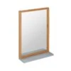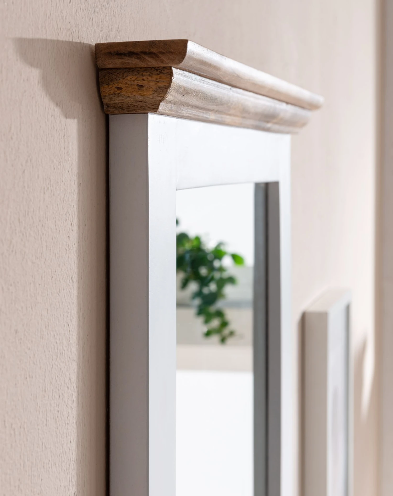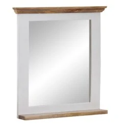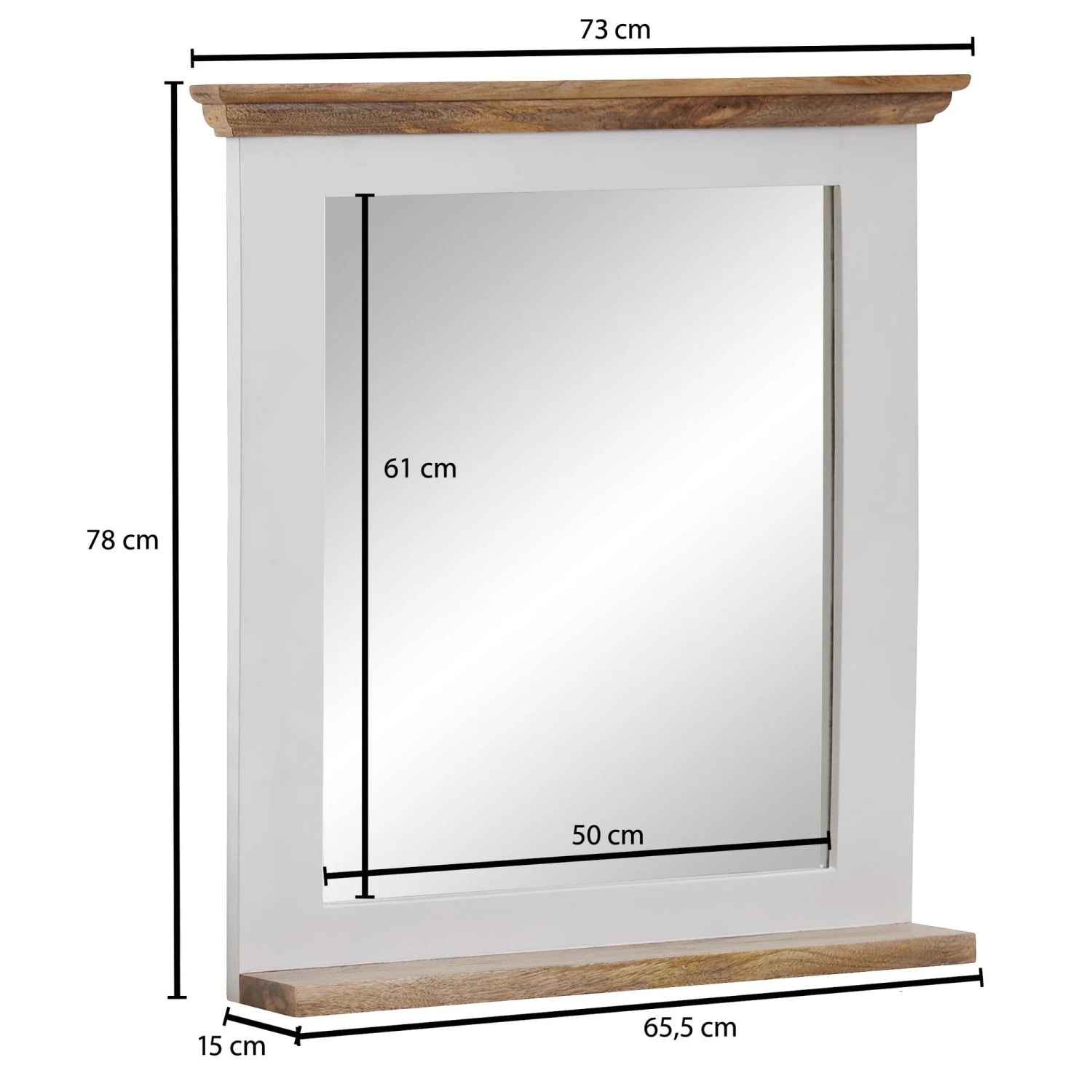 Design Moderner Wandspiegel in rechteckiger Form Farblich abgesetzte Oberkante und Ablagefläche Dekorative Zierfräsungen entlang der oberen Kante Aufgrund des Designs in vielen Räumen einsetzbar Abmessungen Breite: 73 cm Höhe: 78 cm Tiefe: 15 cm Spiegel (BxH): 50 x 61 cm Ablagefläche (BxT): 65,5 x 12 cm Materialstärke Holz: ca. 3 cm Farbe Rahmen: Weiß Oberkante und Ablage: Braun Besonderheiten Jeder Spiegel wurde in liebevoller Handarbeit gefertigt und ist somit ein absolutes Unikat Aufgrund des verwendeten Naturprodukts kann es zu leichten Farb- und Maßabweichungen kommen Vorrichtung zur Wandmontage an der Rückseite des Spiegels Praktische Ablage für Zahnbürsten, Deo, Parfüm und vieles mehr Holzschutz bietet die Schutzlackversiegelung der Holzoberflächen Empfohlene Maximalbelastbarkeit: 5 kg Material Spiegelfläche: Glas Rahmen: Mango Massivholz, weiß lackiert & mit klarem Schutzlack beschichtet Oberkante und Ablage: Mango Massivholz, mit klarem Schutzlack beschichtet Rückwand: MDF Lieferumfang Ein Badspiegel ohne Dekoration Montagematerial für die Wandbefestigung ist nicht im Lieferumfang enthalten, da dieses von der Wandbeschaffenheit abhängig ist Montage Lieferzustand: komplett montiert und sicher verpackt Pflegehinweise Die Spiegelfläche bitte mit Glasreiniger bzw. Fensterreiniger und einem fusselfreien Lappen reinigen. Scheuermittel, scharfe Reiniger und Metallschwämme unbedingt vermeiden.