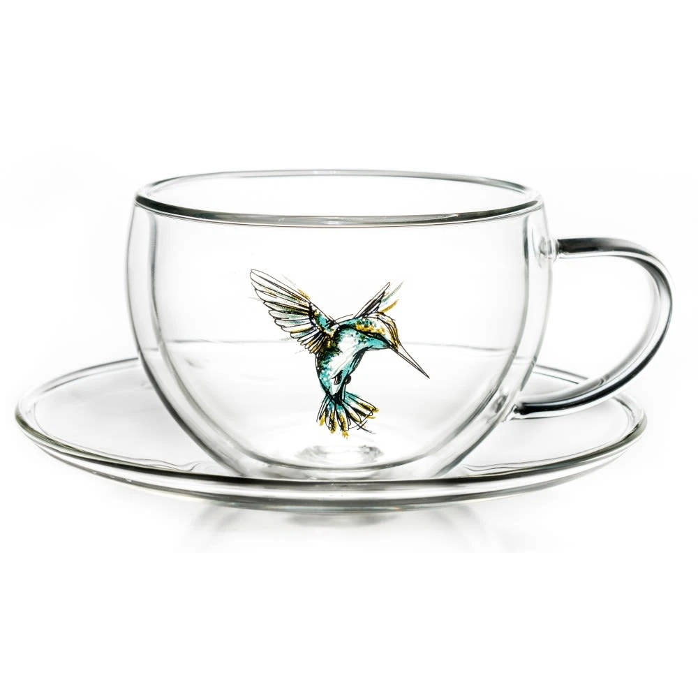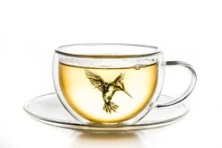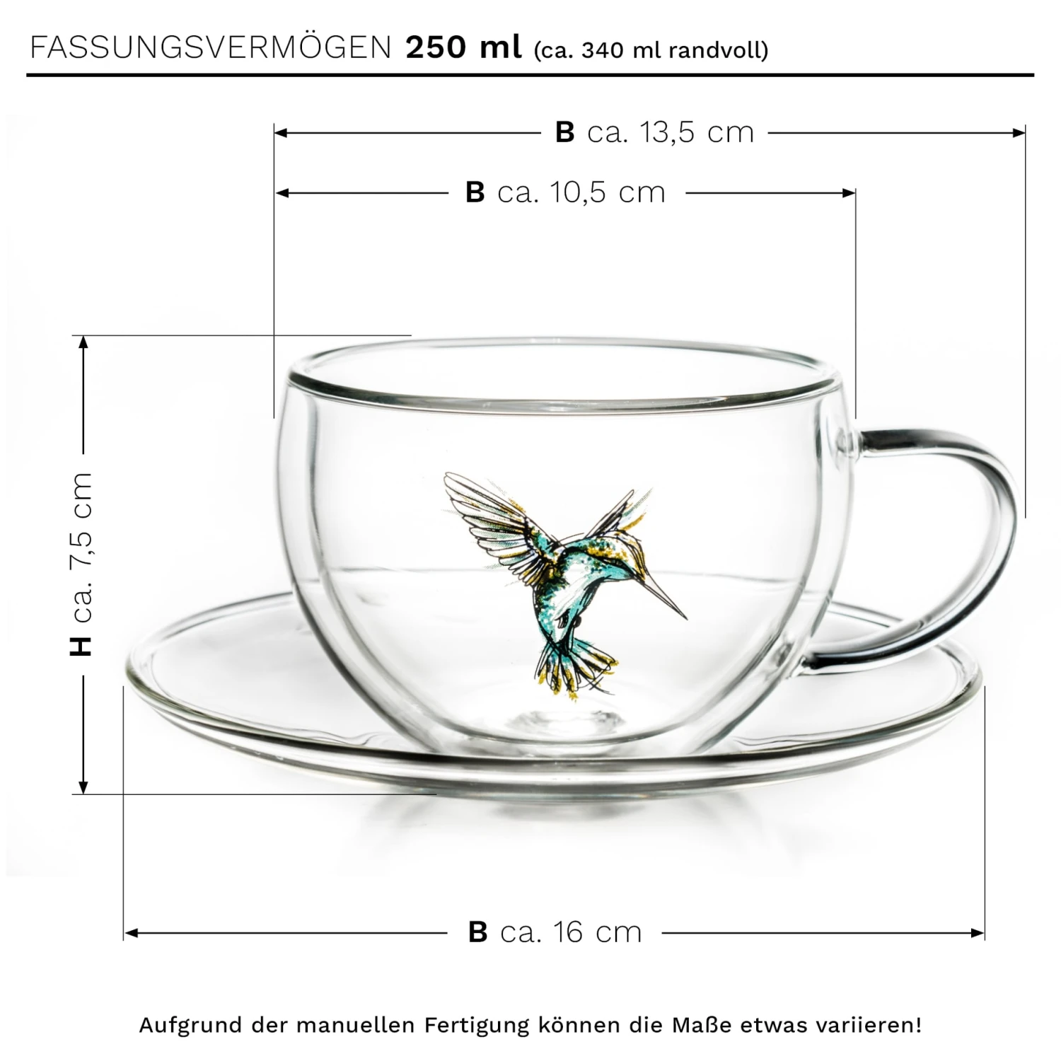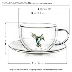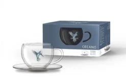 Das Creano – ThermoTassen “Hummi“ ist stylish und funktional zu gleich – das mundgeblasene Doppelwandglas mit seinen hervorragenden Isoliereigenschaften macht´s möglich! Der faszinierende Kolibri befindet sich auf dem Innenglas, sodass dieser auch nach langem Gebrauch seine Schönheit behält. Zur Herstellung wird hitzebeständiges Borosilikatglas verwendet, das leicht und filigran ist, aber dennoch robust die hohen Anforderungen des Alltagsgebrauchs meistert. Dank des Isoliereffektes – ermöglicht durch die Luft zwischen den Glasschichten – bleiben Heißgetränke wie Kaffee oder Tee länger heiß und Kaltgetränke länger kalt. Zudem sorgt das Doppelwandglas für ein stets gleichmäßig temperiertes Außenglas, so dass auch ein mögliches Verbrennen der Finger der Vergangenheit angehört. Toller Effekt außerdem: kein störendes Kondenswasser, somit keine lästigen Ränder auf dem Tisch beim Genuss von Kaltgetränken. Viel Vergnügen mit Ihrem “schwebenden Getränk“, aus dessen Quelle unser Kolibri seinen Nektar zieht! Inhalt: 1 Creano-ThermoTasse mit Untertasse “Hummi“ – blau in exklusiver Geschenkbox. Merkmale: isolierend, handgearbeitet, hitzebeständiges Borosilikatglas, 250ml Fassungsvermögen, spülmaschinenfest