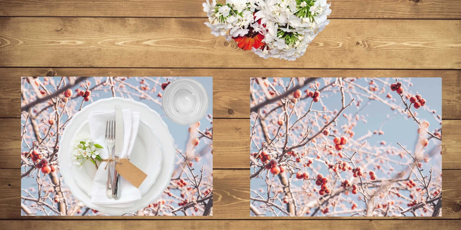 Tolle Tischsets mit Vogelbeeren. Macht Lust auf die schönste Zeit des Jahres, verwandelt Ihren Tisch in einen echten Hingucker und gibt ihm eine individuelle Note! Die Platzsets der Tischsetmacher sind die ideale Kombination aus Schutz vor Flecken und einzigartiger Tischdekoration mit Stil! Umweltfreundlich, recyclingfähig und mehrfach verwendbar. Verpackungseinheit 12 Stück (Größere Auflagen auf Anfrage).