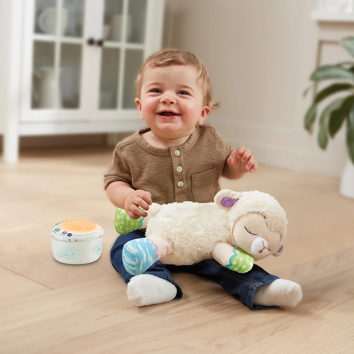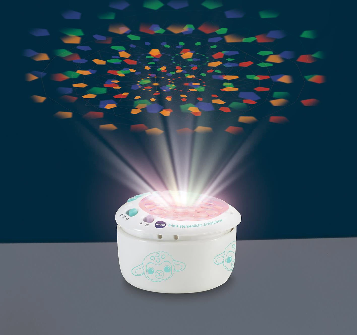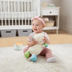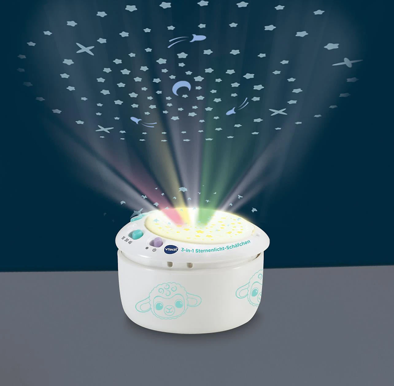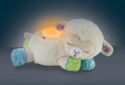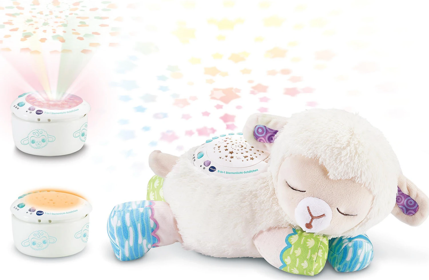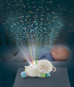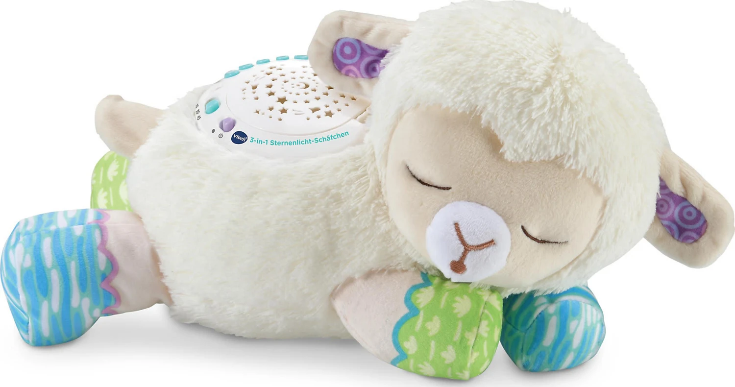 Das 3-in-1 Sternenlicht-Schäfchen von Vtech ist ein niedlicher Kuschelbegleiter, der kleinen Kindern in ihren Bettchen Gesellschaft leistet. Es kann jedoch mehr als nur kuscheln: auf Wunsch projiziert es einen beruhigenen Sternenhimmel an die Decke, singt Lieder oder spielt angenehme Naturgeräusche ab. Die Klänge können durch das Weinen des Babys erneut aktiviert werden.